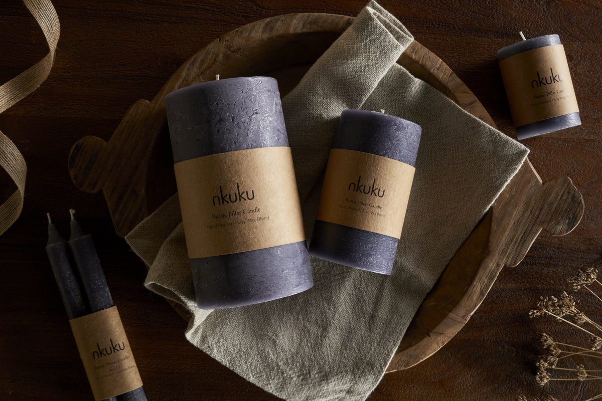 A lit nkuku Rustic Soy Blend Mini Pillar Candle in charcoal, with a textured finish, sits on a bronze handled holder atop a wooden table. Nearby are an unlit candle, a ceramic cup, a dried flower vase, and an open book.The nkuku Rustic Soy Blend Mini Pillar Candle in Charcoal, featuring a textured finish, sits on the table and adds a charming touch to the setting.The Rustic Soy Blend Mini Pillar Candle - Charcoal by nkuku, featuring a textured finish, sits on a folded gray cloth in a wooden bowl on a wooden surface, accented by dried flowers.A set of purple textured candles with brown nkuku labels sits on a wooden tray with a folded beige cloth atop a dark wood surface. Nearby are dried flowers, ribbon, and the nkuku Rustic Soy Blend Mini Pillar Candle in Charcoal.The Rustic Soy Blend Mini Pillar Candle - Charcoal by nkuku is a grey mini pillar candle with a textured finish and a brown label, shown against a white background.