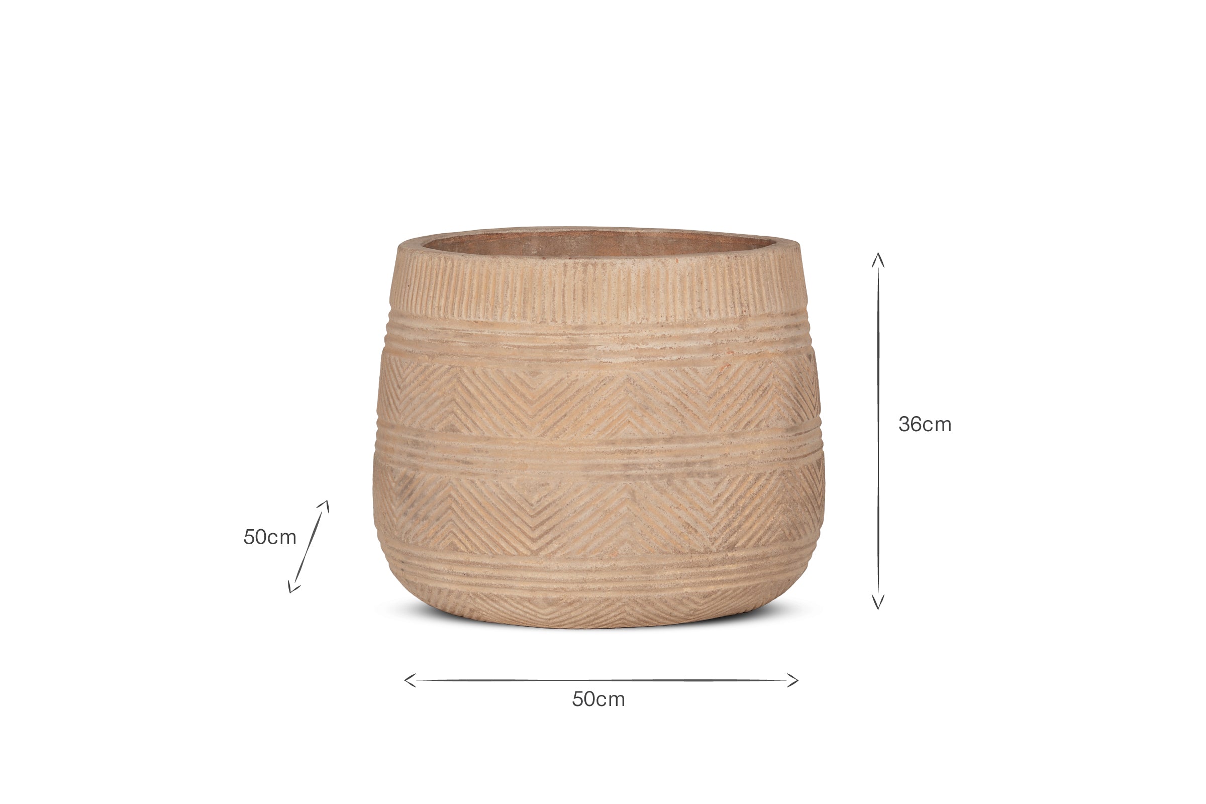 Bring warm hues to an outside space with our extra large Zadie planter in natural terracotta. The authentic chalky finish of the Zadie fits effortlessly into your outdoor space, quietly complementing the natural environment. Each planter is decorated with an attractive pattern that has been etched by hand, adding a thoughtful layer of texture. This extra large planter is an ideal option for olive or citrus trees. The Zadie collection is handmade using a coiling technique, the rolls of clay are layered onto each other, then smoothed into shape. Also available in grey.